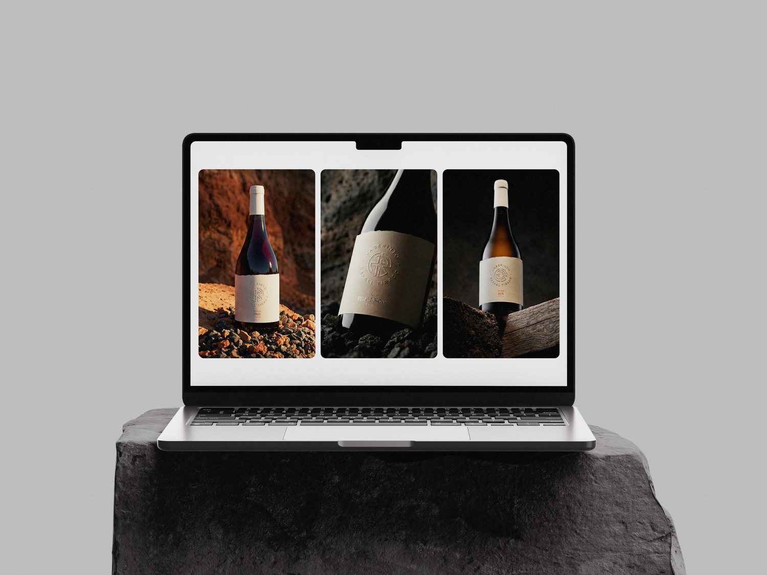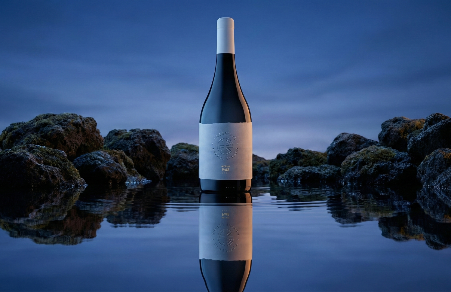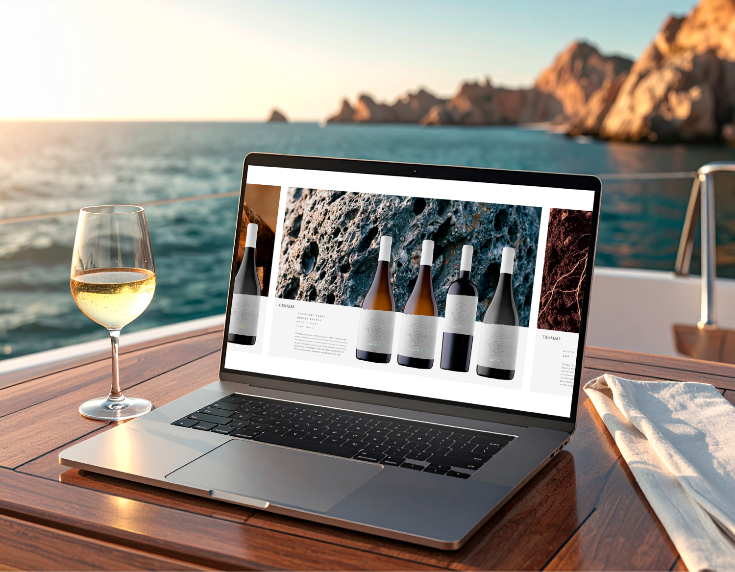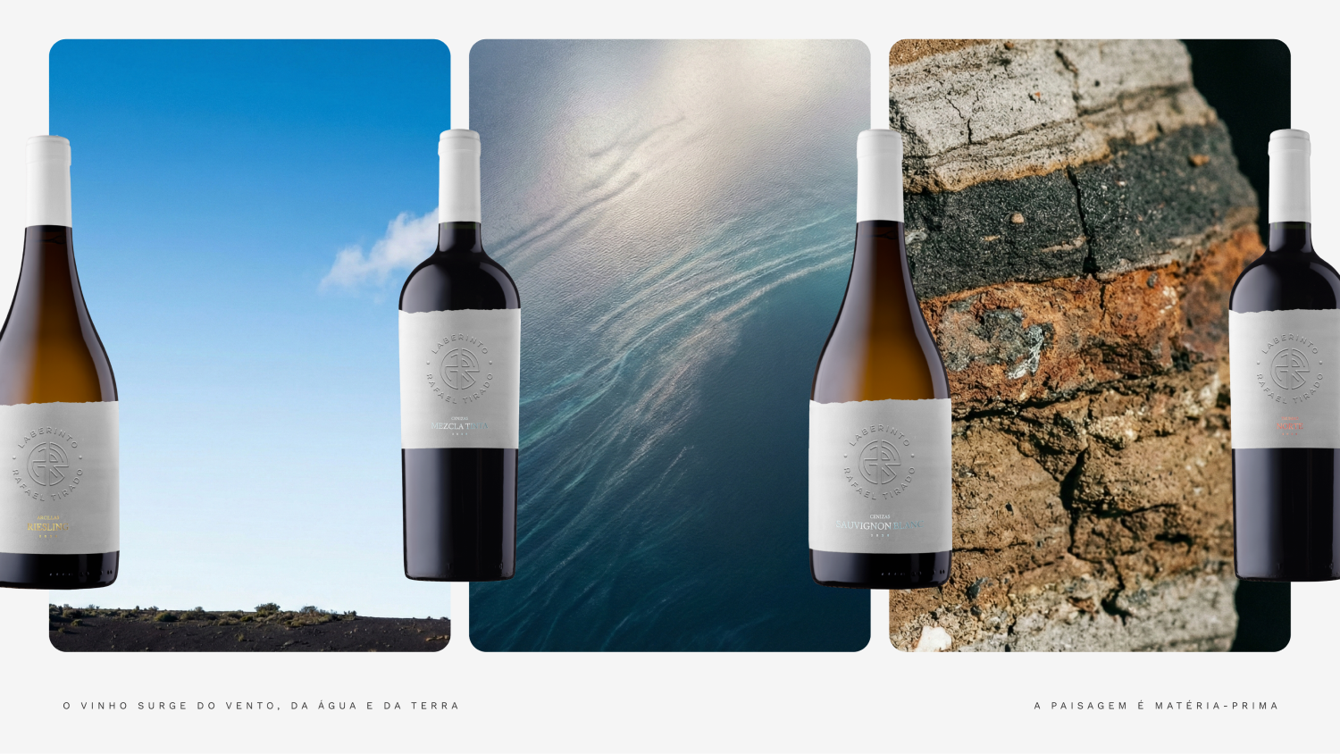 Traduzimos isso nas diretrizes de imagem e fotografia com referências ao universo náutico, como água, condensação, orvalho, e texturas que evocam o solo vulcânico e a mineralidade do terroir.